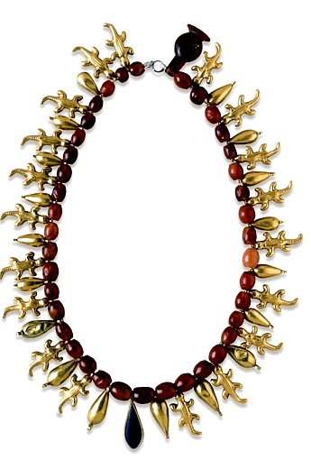 Hollow gold lizards alternate with cornelian barrel beads and hollow gold date-shaped pendants. The central gold drop is inlaid with lapis lazuli and a cornelian cornflower pendant is attached at one end of the string. As well as being decorative, it was believed that these necklaces endowed the wearer with the powers and qualities symbolized by the amulets . For example, the fly was seen as a symbol of persistence and the lizard as one of regeneration because of its ability to re-grow wounded