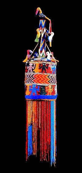 Beaded and veiled crowns, ade ileke , are traditionally worn by those kings who could trace their ancestry to Ododua, the mythic founder and first king of the Yoruba people. The crown is called an orisha , a deity, and is placed upon the king’s head by his female attendant. Powerful medicines are placed at the top of the crown to protect the king’s head and thus his future. The veil that covers the king’s face hides his individuality and increases attention on the crown itself, the real centre o
