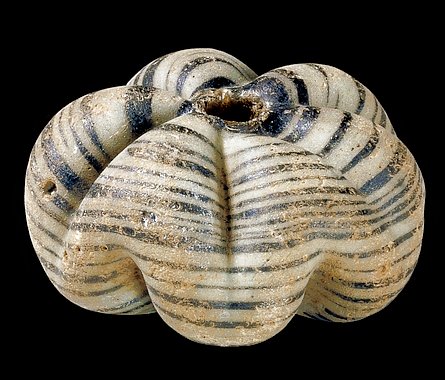 This extraordinary ‘bead’ is made of opaque white glass with translucent purple marvered trails. It is exceptionally large and made in the shape of a bun with a flat base and the upper surface divided into six segments. It has a wide central piercing. The bead was found in 1860 in a woman’s grave. Also in the grave were a ring made from the burr end of a red deer antler, an iron purse-bar and a group of amber beads, some found at the neck and one at the right hand. The excavator indentified the