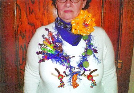 I think JANE WEST should be the winner!! Her ugly necklace has class~~and can be worn for SO MANY seasons! What style! It looks like she spent a lot of time planning and stitching this one. When she wears this out in public I’ll bet she gets the MOST attention!