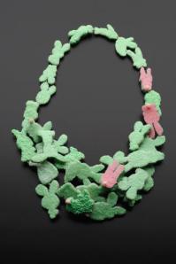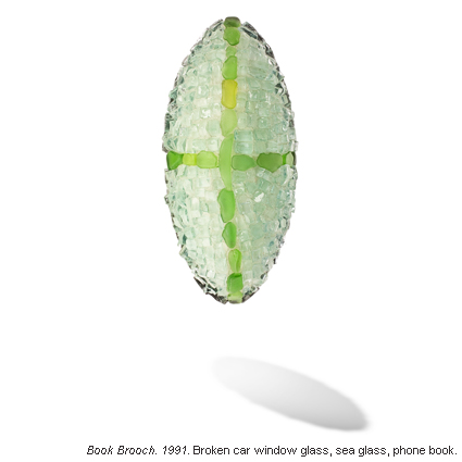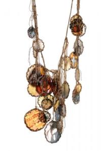 This exhibit highlights jewelry made from materials other than gold, platinum or silver. Many use found objects. There are many “green” objects and materials.