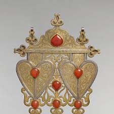 Turkmen women’s jewelry consisted of headgear in the form of crowns, caps, headbands, and braid ornaments; pendants attached to headdresses and suspended on either side of the head; earrings; pectoral and dorsal ornaments; amulet holders; appliqués for clothing; armbands; and rings.