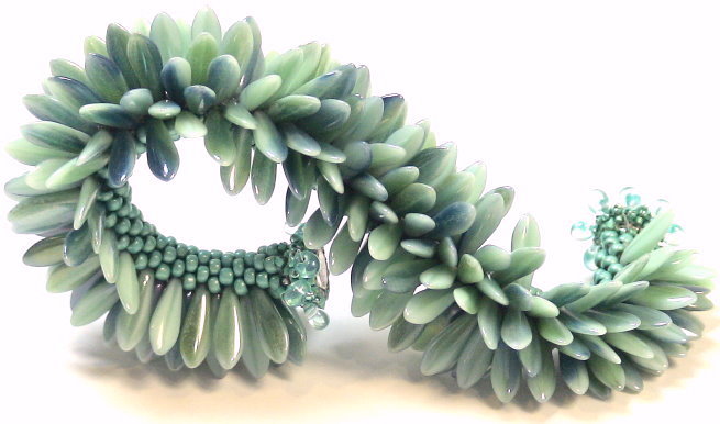 You have to control your stringing material. With needle and thread, you have to be able to get from your fingers to the needle to the beads, back along the thread to the needle to the fingers, hands, arms, eyes, mind. And then again. And again. Over and over, one more time. You need to get into a rhythm. All these working parts need to be working. No time for cramping. No time to get tired. No time to lose concentration.