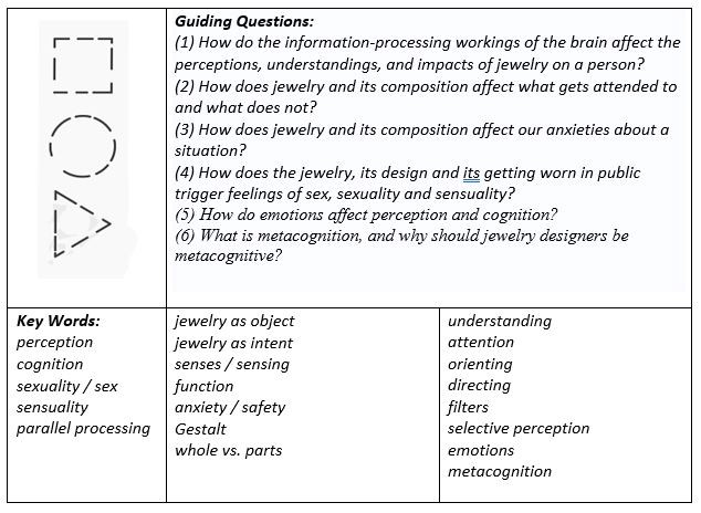 Picture a piece of jewelry. This jewelry will present many stimuli — color, placement, proportion, balance, volume, positioning, its relation to the human body, the context within which it is worn, perhaps how comfortable it feels, symmetry, and the list can go on and on. Which perceptual clues are most important to the person who needs to decide whether to wear or buy it? Attention is the first cognitive step in determining how to answer this, though the observer does not always consciously grasp the specifics of what is going on.