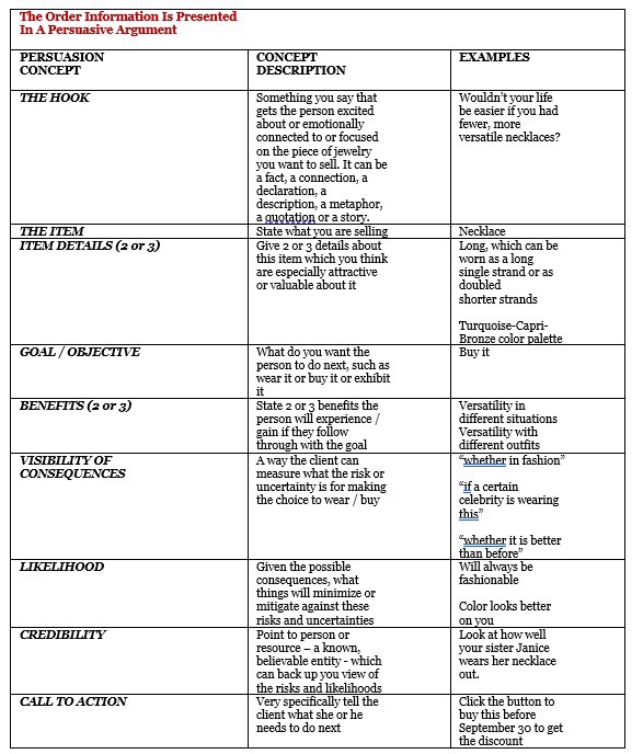 Designers need to get the approval of and payment from their clients. That means the client has to recognize and share the choices the designer made when creating the piece of jewelry. It all comes down to two aspects of marketing: persuasion and influence. Marketing is about creating persuasive arguments which can influence a person’s beliefs, attitudes, motivations, intentions and behaviors. Influence comes with knowing what the best outcome that the marketer should seek. Persuasion includes the tools you use to get there. Persuasion can take many forms. The marketer’s success depends on a handful of persuasive factors. Marketing strategies follow one or more of eight universal principles of persuasion. Information within any successful persuasive argument is best presented in a certain order.
