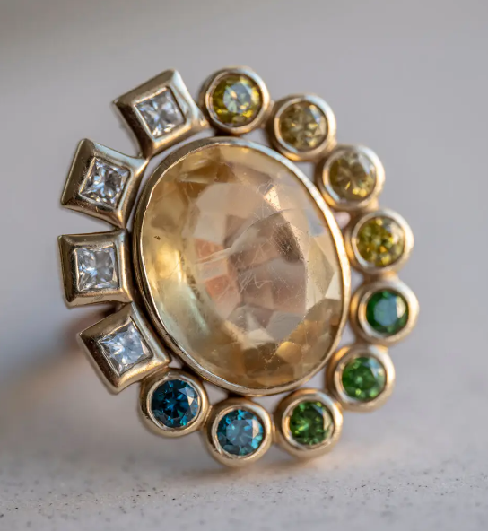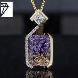 Matthew Piorkowski’s winning piece, “Interstellar”, features a stunning fantasy-cut octagon ametrine showcased in a custom yellow-gold pendant setting. Centered on the bail is a brilliant square-shaped diamond with sixteen accenting diamonds along the left side of the pendant mounting, creating visual interest along the path of the diamonds.