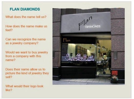 The name “FLAN” doesn’t suggest anything associated with jewelry or the emotions jewelry should evoke. The name “FLAN” doesn’t connect in any way with people who might be looking to buy some jewelry. The name “FLAN” doesn’t lend itself very well to the kinds of imagery you might use in a logo, or on a business card or on a website. The name doesn’t really make you want to find out more information about the company.