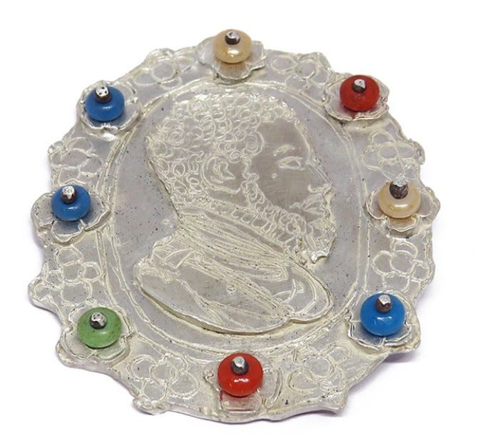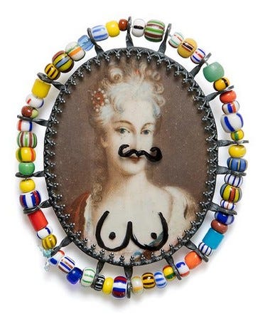 Geraldine Fenn, Colonial Comeuppance I, 2022, brooch in silver, found object (vintage painted miniature), glass, glass trade beads, steel pin, photo courtesy of the artist
