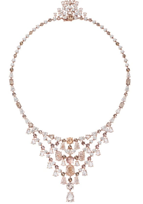 “Recent jewelry collections have played with the style, too, featuring pieces that achieve a barely there effect on some wearers through the use of soft-tone metals and skin-matching stones. Other designs have open structures that would play peekaboo with any skin color.”