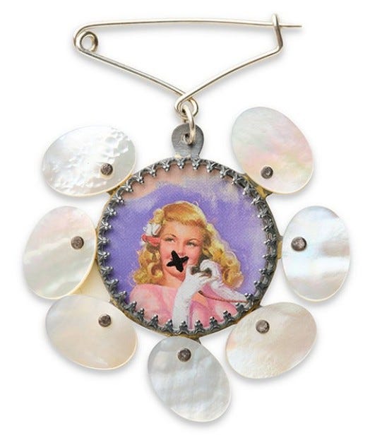 Geraldine Fenn, Pin-Up Girl II, 2024, brooch in silver, glass, printed card, mother-of-pearl, photo courtesy of the artist