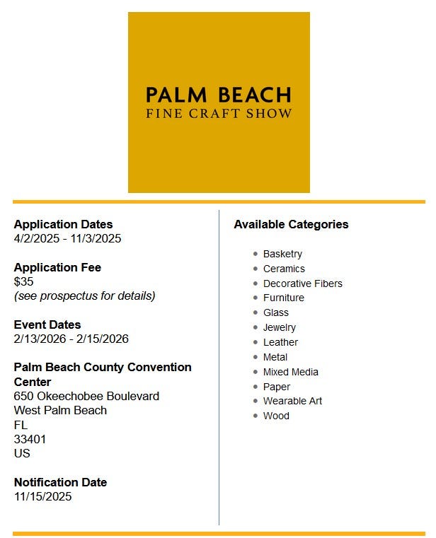 3. PALM BEACH FINE CRAFT SHOW: Call For Applications