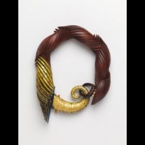 “The unique works on display in Hanging Around are from the Museum of Arts and Design’s jewelry collection. Dating from the 1960s to the present, these artistic creations encompass conceptual approaches ranging from the decorative to the provocatively political. Some of the necklaces on view feature precious metals and rare gemstones, but others derive their impact from materials as unconventional as pig intestines, gun triggers, mustard seeds, LED lighting, black coral, butterfly wings, phone directories, mirrors and lenses. The fabrication techniques employed by the artists are as different as traditional goldsmithing and cutting-edge digital prototyping.”