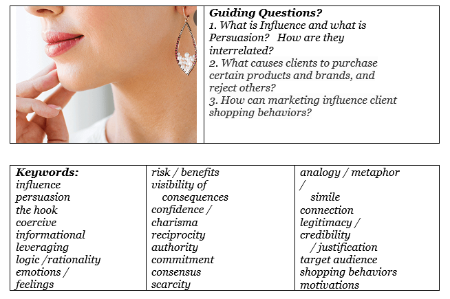 Marketing is about creating persuasive arguments which can influence a person’s beliefs, attitudes, motivations, intentions and behaviors. The marketer wants to be able to persuade the client to focus their attention on the jewelry product line, to approach it, touch it, try it on, buy it, exhibit it, share it with others, then, moreover, to further persuade these others (thus making the marketing message contagious) to want to buy it. Influence comes with knowing what the best outcome that the marketer should seek. Persuasion includes the tools you use to get there.