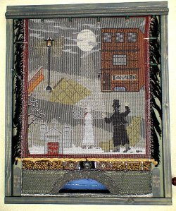 Here we use the concept of “Tapestry” in its broadest sense as a stitched, sewn and/or woven wall hanging. Your tapestry may be woven, loomed, stitched, quilted, cross-stitched, crocheted, knitted, sewn, braided, knotted, embroidered, macramed, beaded and the like. Your tapestry will combine fibers/threads/and/or cloth and beads in some way, and must consist of at least 70% beads. Beads may form the background canvas of your piece, and/or may be used to embellish your canvas, and/or as fringe, and/or as stitchery covering parts of your piece. Your piece should be mounted or framed in some way, ready for hanging on a wall. Your tapestry may utilize many different techniques. In addition, as a “Mystery Genre Book Cover”, your Beaded Tapestry should woo and entice the viewer to want open that cover and read the book!