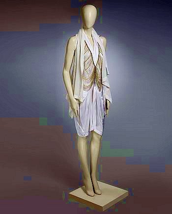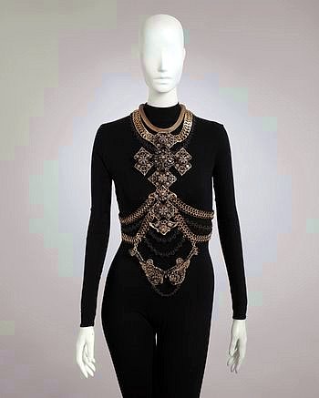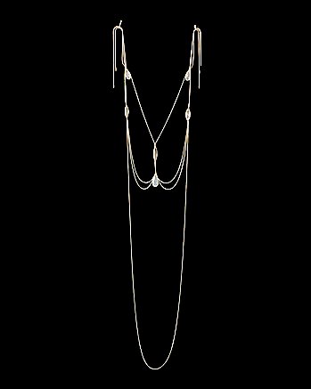 COUTURELAB: ” Inspired by antique garments, interiors and art, the designer produces one-off pieces that evoke the past while electrifying the present. Let Walid’s Silver and Gold Lattice necklace swathe you in its scintillating embrace. White-metal curb chains, backed with fabric for a comfortable fit, form the vertical supports for strings of faceted and globular beads and rope-style links. Coursing your body in a series of scintillating silvery and golden crescents, these converge above your navel to sculptural effect. To put the piece on, simply slip your arms into the armholes and tie the waist chain behind your back.”