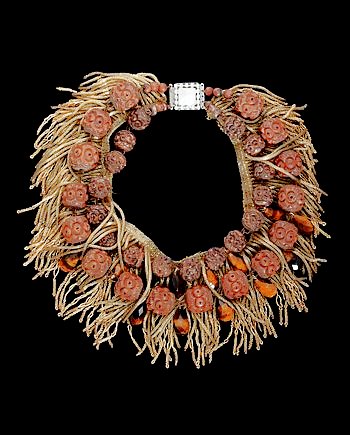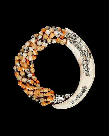COUTURELAB: “Mesmerizing reflections and refractions, colorways and constructions, surfaces and textures – these are the raw materials for Eileen Coyne’s alchemy. From her London atelier, the designer creates jewelry, kaftans and precious-skin belts inspired by the aesthetics of ethnic peoples around the world. Make the primal charisma of Eileen’s agate and boar’s tusk necklace your own. Spherical and egg-shaped agate beads array with carved and contoured pillars of blackened silver to form seven interwoven ropes. At one end, these are fixed to an arc of boar’s tusk, its exquisitely grained surface festooned with textured silver. At the other end, the ropes attach to a rough-hewn silver ingot which hooks onto the tusk to close the circle around your neck.”