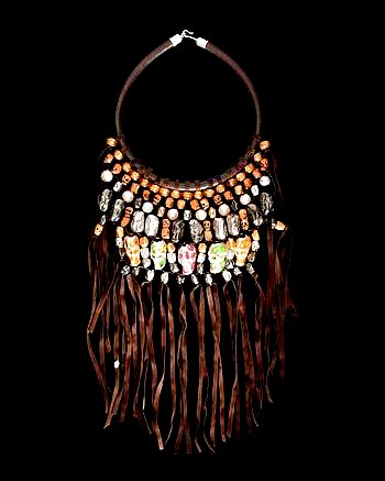 COUTURELAB: “Italian designer Delfina Delettrez is renowned for her skill in melding unusual and exotic materials, to create character pieces full of charm. Infused with romance and the macabre, these pieces reflect your strength of personality and stylish wit.  Delfina’s Brown Wudu Necklace has a raw tribal quality to its design. Set on a rich black leather necklace is a woven bib section containing rows of grinning skulls carved from sumptuous silver and glossy bone with fringed soft suede tassels. The unique materials complement each other and create this edgy statement piece which will add a strong accent to the simplest of outfits.”