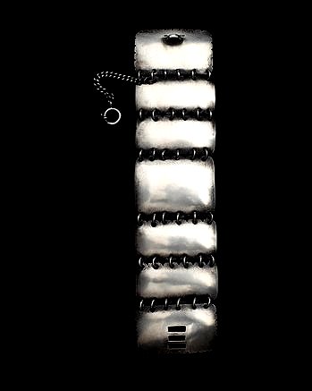 COUTURELAB: “As part of the Antwerp Six Anne Demeulemeester was responsible for creating a radical new vision for fashion in the 1980’s. The strong sense of innovation and creativity inherent in her work means her designs still look fresh and has a strong sense of appeal in current times.  …With this silver plates bracelet, Demeulemeester has taken simple polished silver rectangles and worked them in to a stunning piece which fuses armour and accessories, the silver plates have a brushed surface which has a subtly shiny finish. Each plate has a fluted edge linked by small polished silver circles and the bracelet fastens with an innovative clasp where one plate slots through another and is secured with an oversize clasp.”