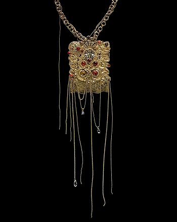 COUTURELAB: “Truly unique, this golden bejeweled piece is mesmerizing. Sculpted to a rustic finish with a chunky chain necklace, the gilded keepsake pendant is encrusted with amber-colored gems and stones and adorned with draping delicate chains.”