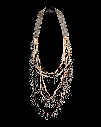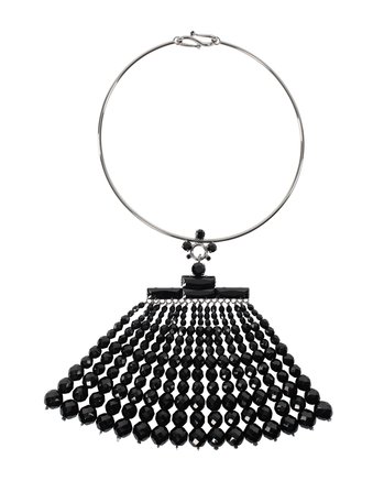 COUTURELAB: “Project beauty and mystery in Walid’s “Sanctum” necklace. A broad satin band encrusted with 19th-century gunmetal beads wraps comfortably around your neck. Joining the ends are fascinating perforated crochet ribbons, from which chains of smoky metallic beads cascade low over your body, catching the light with your every movement.   Formed only from vintage materials, this piece may contain signs of age or wear. These are to be seen as unique memorials rather than flaws.”