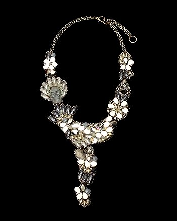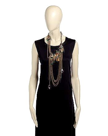 COUTURELAB: “For Bea Valdes, each piece is an exploration and the material her muse – the sway of glass drops, the sheen and shine of metals, ribbon’s sensual embrace. Hand-made in the designer’s native Philippines, these painstakingly conceived and executed compositions stand testament to her philosophy of ‘Just one bead at a time’.   …A beautiful combination of grey, green and beige beads and crystals, Bea’s “Hannibal” Necklace adds luxurious glamor to your outfit. Beige enamel drops and a beautifully carved olive-green skull lie between the dazzling oval and pear-shaped crystals in shades of green and grey. The necklace is edged with tiny beads to ensure a dynamic display against your skin or outfit. A chain of brass-effect links closes the circle. Use the extender section to adjust the necklace’s length, then secure with the lobster-claw clasp. For a comfortable fit, the whole main assembly is backed with fabric-covered padding; flexible construction contours the design closely to your body. ”