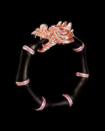 COUTURELAB: “Into your life, Lotus Arts de Vivre brings objects of outlandish beauty inspired by the flora, fauna and legends of south-east Asia. Rather than mass produced to meet a pre-prepared design, each piece is hand-crafted in Thailand to observe and enhance the unique forms and traits of the natural materials that comprise it. Fabulous sea shells and coral, rare animal skins, hulks of ancient wood, jungle seed pods, precious and semi-precious gems – no two examples exactly alike – are honed and combined to make jewelry, accessories and home-wares beyond compare. Machine working is minimal. Instead, teams of artisans deploy traditional decorative skills – all but extinct beyond the region – to invest each creation with timeless fascination and eternal value.   Wrap your wrist in the electrifying embrace of Lotus Arts de Vivre’s dragon bracelet. Sections of precious ebony wood, and silver rings plated with radiant 9K rose gold and encrusted with rubies, interface to form this spectacular circuit; silver is hand carved and coated with gold to form the fantastical creature’s head. Elastic wire, invisibly threaded through the centre of the piece, allows it to flex for an exact and comfortable fit.”