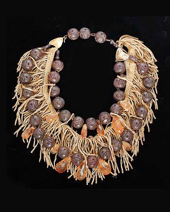 COUTURELAB: “Walid’s accessories combine his extensive fashion knowledge and love of history with the best in vintage and unusual materials. This wonderful statement necklace combines antique gold fringing, with dark wooden beads and sparkling citrine teardrops. The result is a heady mix of rich gold colours and textures which will inject some statement style into any outfit. the ingenious combination of vintage materials and modern design give this piece a timeless quality and make it one to treasure.”
